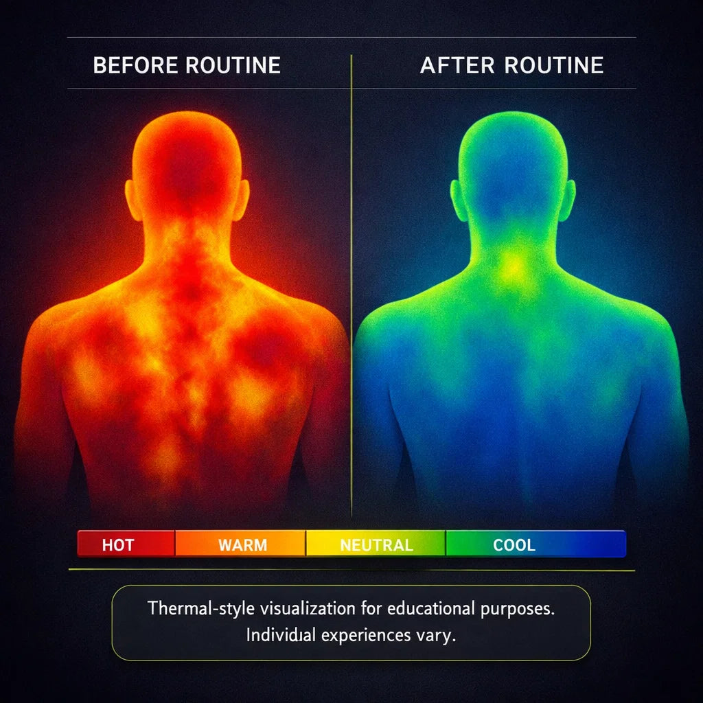 The graphic below is a thermal-style visualization used to illustrate how the body can look when it’s running “hot” from daily stress and tension—versus a more even, balanced pattern after a consistent grounding routine.